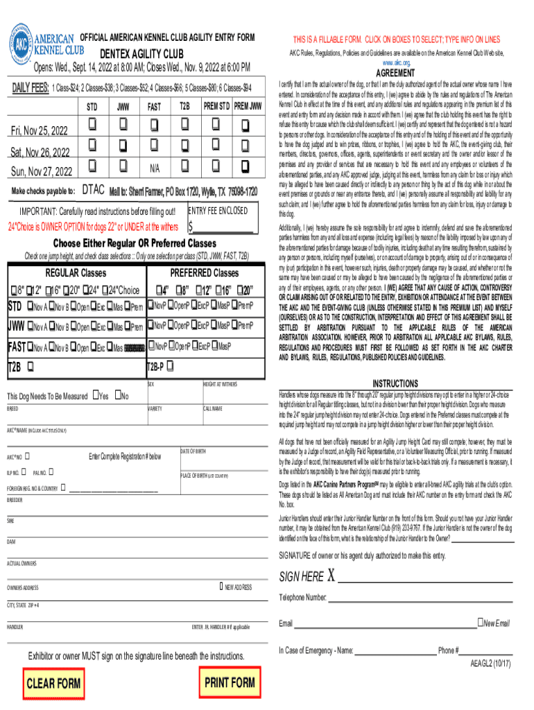 CORRECTED TENTATIVE RUNNING ORDER AS OF OCTOBER 18, 2022DEN TEX AGILITY CLUB (Licensed by the American Kennel Club) AGILITY TRIAL PREMIUM LISTAs of January 1, 2021 For Exhibition only (FEO) and Fix