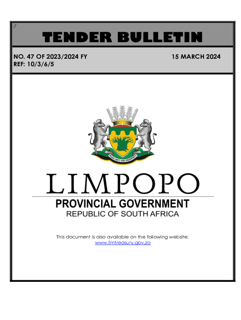 ;/`TENDER BULLETINNO. 47 OF 2023/2024 FY REF: 10/3/6/515 MARCH 2024This document is also available on the following website: www.limtreasury.gov.zaLIMPOPO PROVINCIAL TENDER BULLETIN NO 47 of 2023/24