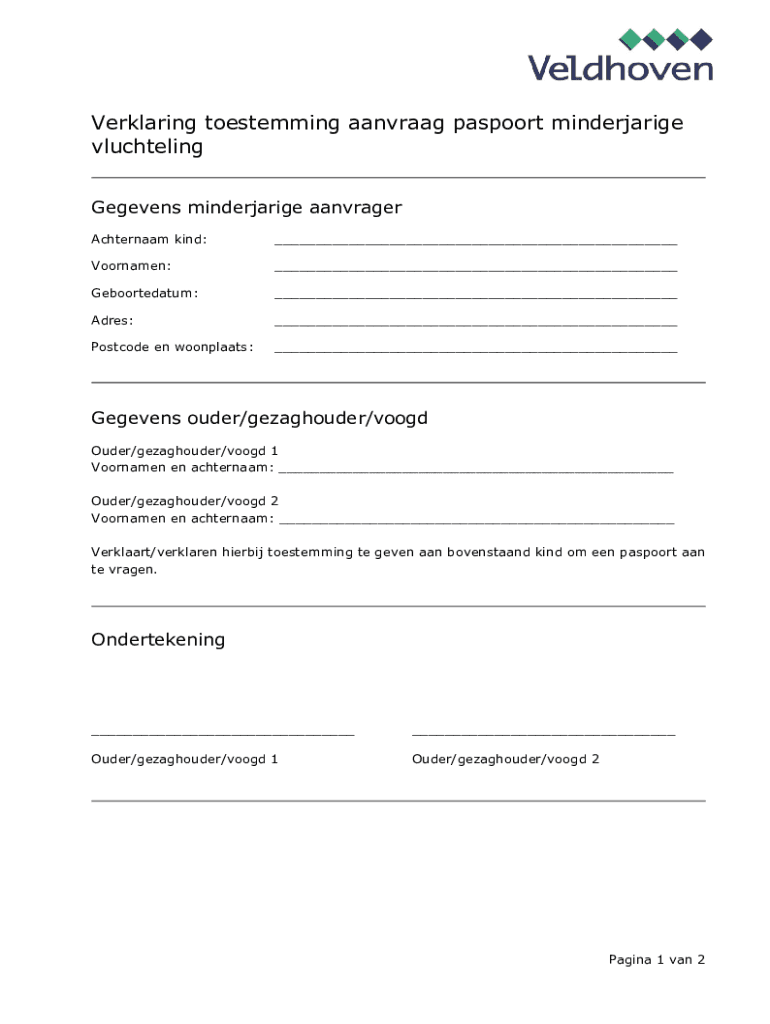 Verklaring toestemming aanvraag paspoort minderjarige vluchteling Gegevens minderjarige aanvrager Achternaam kind:___Voornamen:___Geboortedatum:___Adres:___Postcode en woonplaats:___Gegevens ouder/gezaghouder/voogd