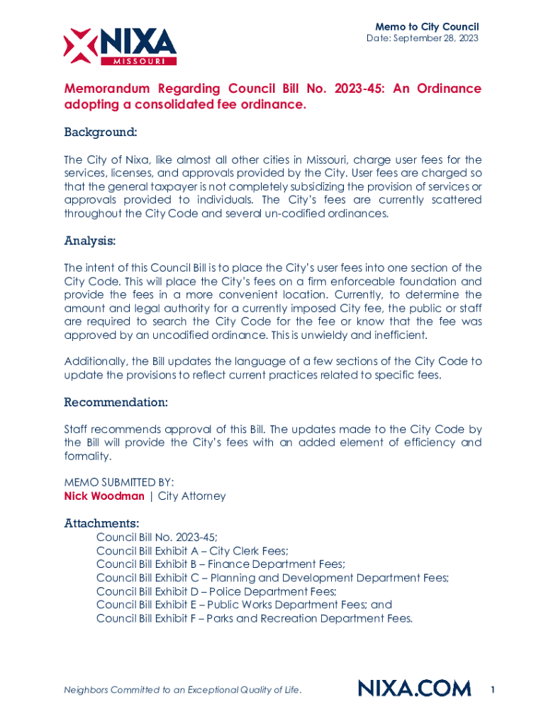 Memo to City CouncilDate: September 28, 2023Memorandum Regarding Council Bill No. 202345: An Ordinance adopting a consolidated fee ordinance. Background: The City of Nixa, like almost all other cities
