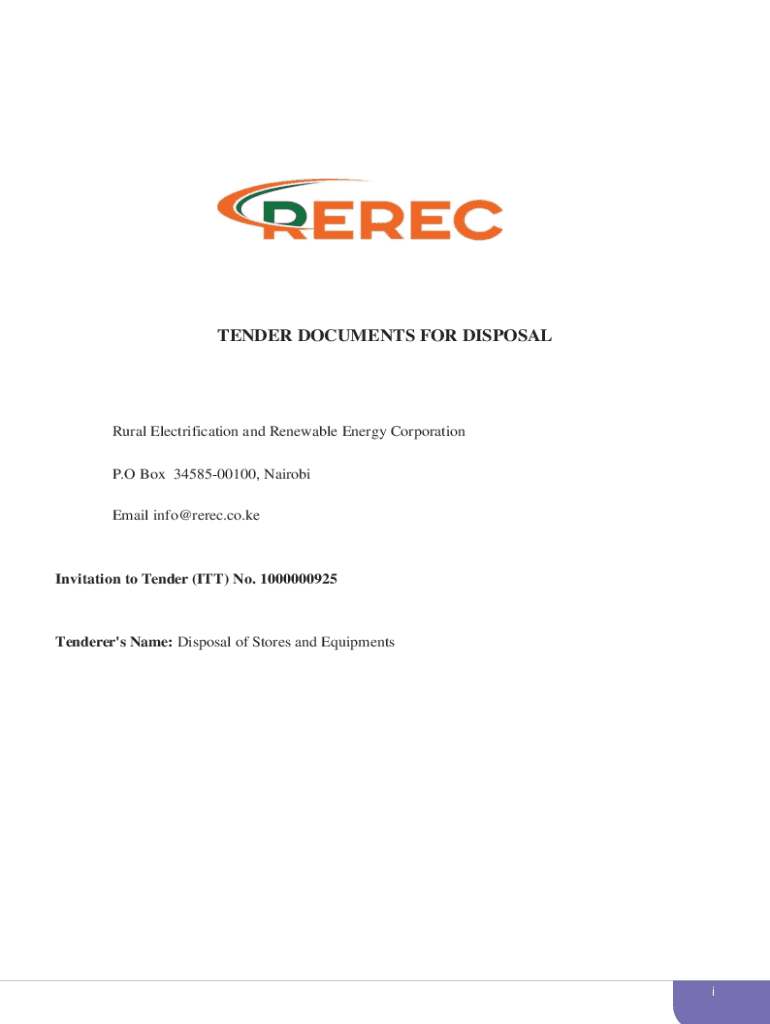TENDER DOCUMENTS FOR DISPOSALRural Electrification and Renewable Energy Corporation P.O Box 3458500100, Nairobi Email info@rerec.co.keInvitation to Tender (ITT) No. 1000000925Tenderer\'s Name: Disposal