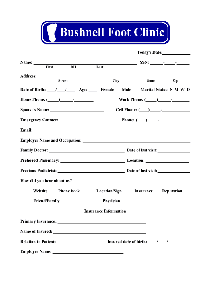 Today\'s Date:___ Name: ___ SSN: _________ FirstMILastAddress: ___ StreetCityDate of Birth: ___/___/___ Age: ___ Female Home Phone: (___)______StateMaleZipMarital Status: S M W DWork Phone: (___)______Spouse\'s