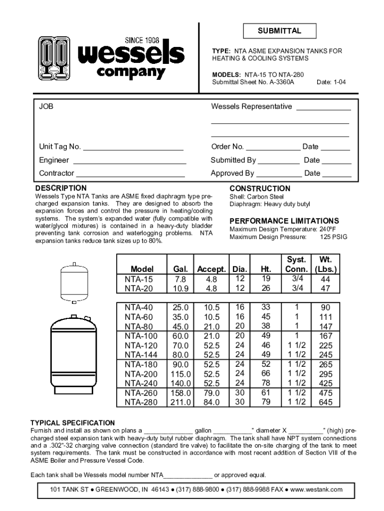 SUBMITTAL TYPE: NTA ASME EXPANSION TANKS FOR HEATING & COOLING SYSTEMS MODELS: NTA15 TO NTA280 Submittal Sheet No. A3360AJOBDate: 104Wessels Representative ___ ___ ___Unit Tag No. ___Order No. ___