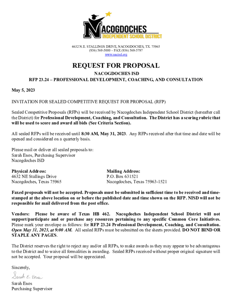 4632 N.E. STALLINGS DRIVE, NACOGDOCHES, TX. 75965 (936) 5695000 FAX (936) 5695797 www.nacisd.orgREQUEST FOR PROPOSAL NACOGDOCHES ISD RFP 23.24 PROFESSIONAL DEVELOPMENT, COACHING, AND CONSULTATION