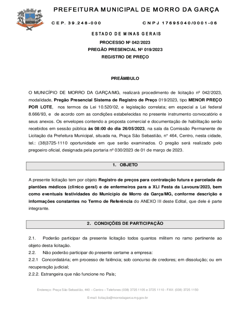 PROCESSO N 042/2023 PREGO PRESENCIAL N 019/2023 REGISTRO DE PREOPREMBULOO MUNICPIO DE MORRO DA GARA/MG, realizar procedimento de licitao n 042/2023, modalidade, Prego Presencial Sistema de Registro