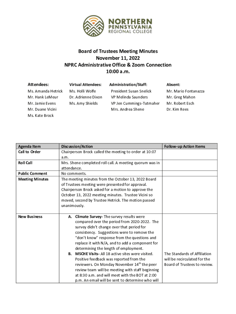 Board of Trustees Meeting Minutes November 11, 2022 NPRC Administrative Office & Zoom Connection 10:00 a.m. Attendees:Administration/Staff: President Susan Snelick VP Melinda Saunders VP Jen CummingsTutmaher