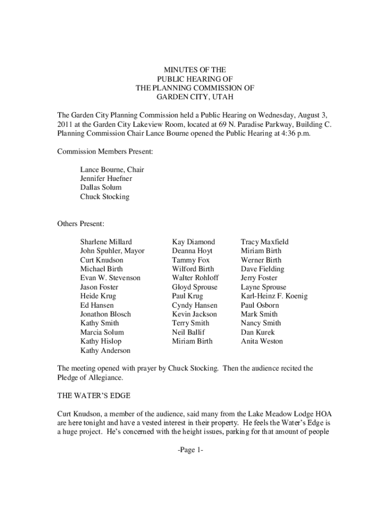 MINUTES OF THE PUBLIC HEARING OF THE PLANNING COMMISSION OF GARDEN CITY, UTAH The Garden City Planning Commission held a Public Hearing on Wednesday, August 3, 2011 at the Garden City Lakeview Room,