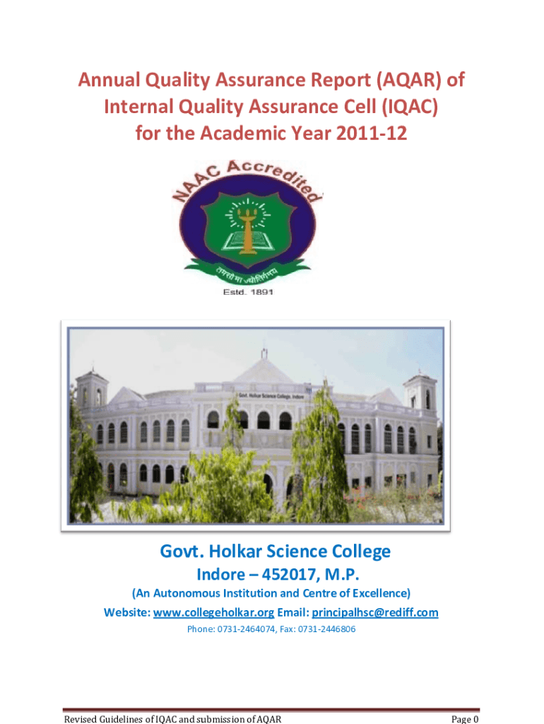 Annual Quality Assurance Report (AQAR) of Internal Quality Assurance Cell (IQAC) for the Academic Year 2011 201112 2Govt. Holkar Science College Indore 452017, M.P. (An Autonomous Institution and