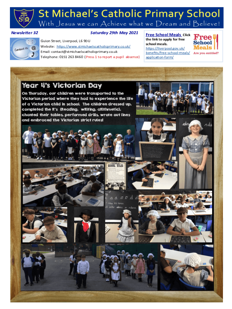 Newsletter 32Saturday 29th May 2021 Guion Street, Liverpool, L6 9DU Website: https://www.stmichaelscatholicprimary.co.uk/ Email: contact@stmichaelscatholicprimary.co.uk Telephone: 0151 263 8460 (Press