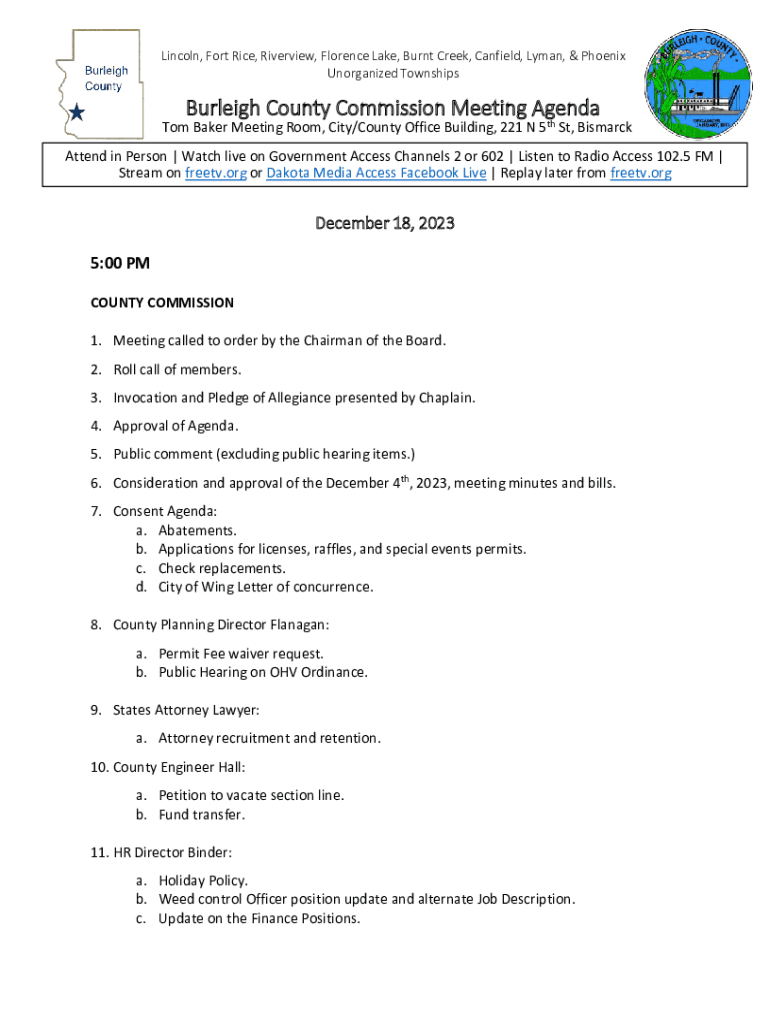 Lincoln, Fort Rice, Riverview, Florence Lake, Burnt Creek, Canfield, Lyman, & Phoenix Unorganized TownshipsBurleigh County Commission Meeting AgendaTom Baker Meeting Room, City/County Office Building,