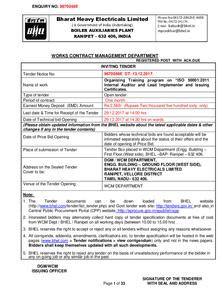 ENQUIRY NO. 9870048EBharat Heavy Electricals Limited ( A Government of India Undertaking) BOILER AUXILIARIES PLANT RANIPET 632 406, INDIAPhone No:04172284259, 4698 FAX No.:04172241176babudr@bhel.in