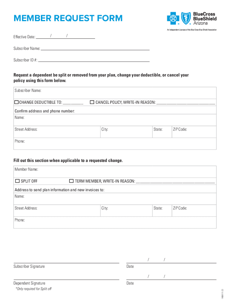 MEMBER REQUEST FORM Effective Date://Subscriber Name: Subscriber ID #:Request a dependent be split or removed from your plan, change your deductible, or cancel your policy using this form below. Subscriber