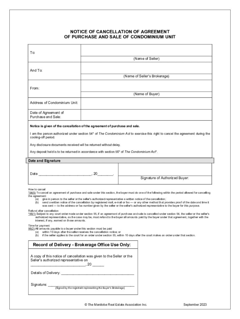 NOTICE OF CANCELLATION OF AGREEMENT OF PURCHASE AND SALE OF CONDOMINIUM UNIT To: (Name of Seller) And To: (Name of Sellers Brokerage) From: (Name of Buyer) Address of Condominium Unit: Date of Agreement