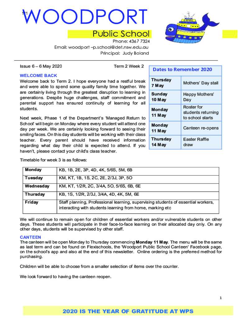 WOODPORT 111Public SchoolPhone: 4367 7324 Email: woodport p.school@det.nsw.edu.au Principal: Judy Boland___ Issue 6 6 May 2020Term 2 Week 2WELCOME BACK Welcome back to Term 2. I hope everyone had