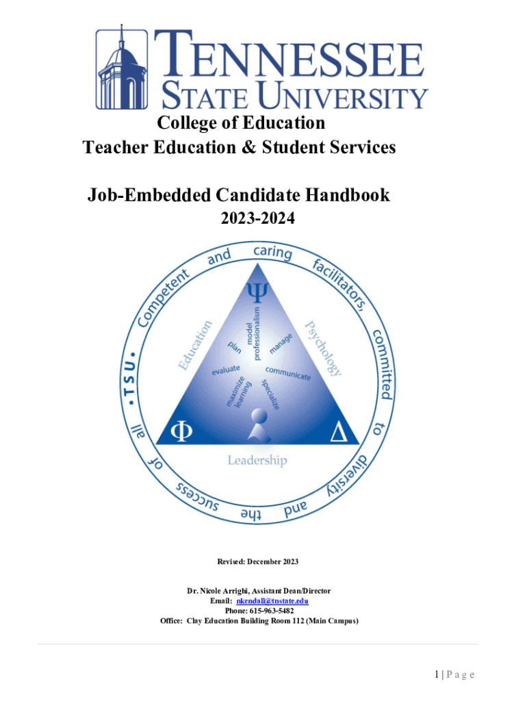 College of Education Teacher Education & Student Services JobEmbedded Candidate Handbook 20232024Revised: December 2023Dr. Nicole Arrighi, Assistant Dean/Director Email: nkendall@tnstate.edu Phone: