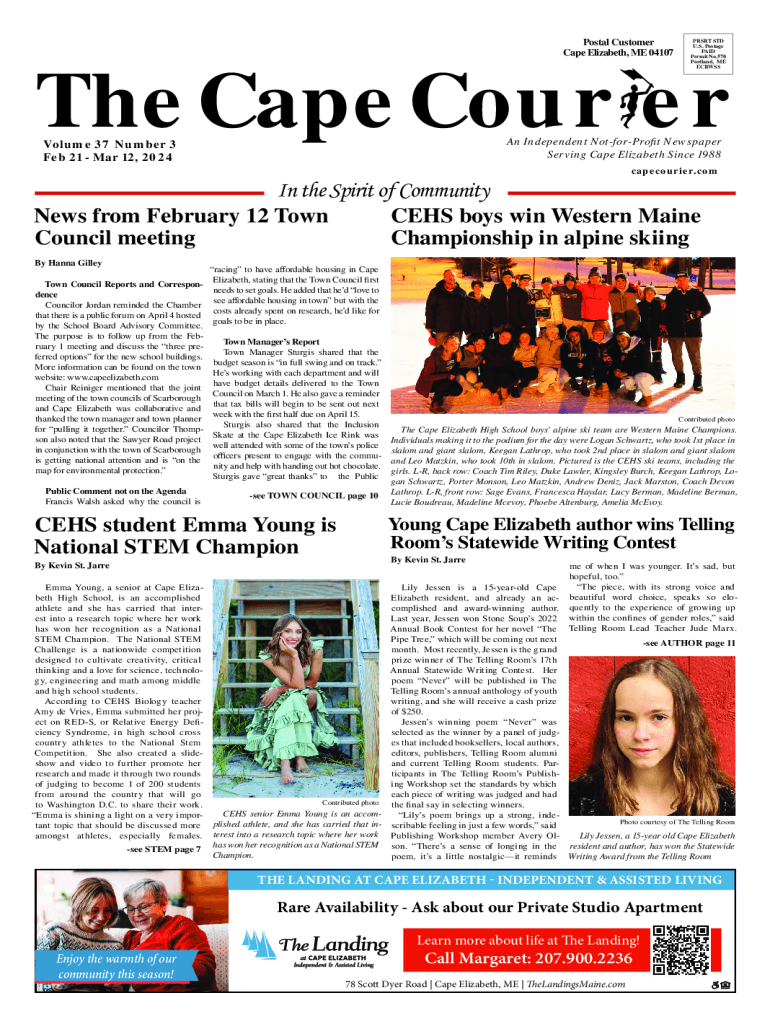Postal Customer Cape Elizabeth, ME 04107PRSRT STD U.S. Postage PAID Permit No.570 Portland, ME ECRWSSThe Cape Cour er An Independent NotforProfit Newspaper Serving Cape Elizabeth Since 1988Volume