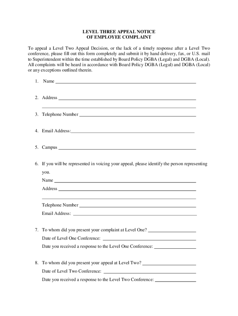 Employees who have unresolved issues after going through the initial complaint levels and who wish to escalate their complaint to a higher authority are required to file employee complaint formlevel three.