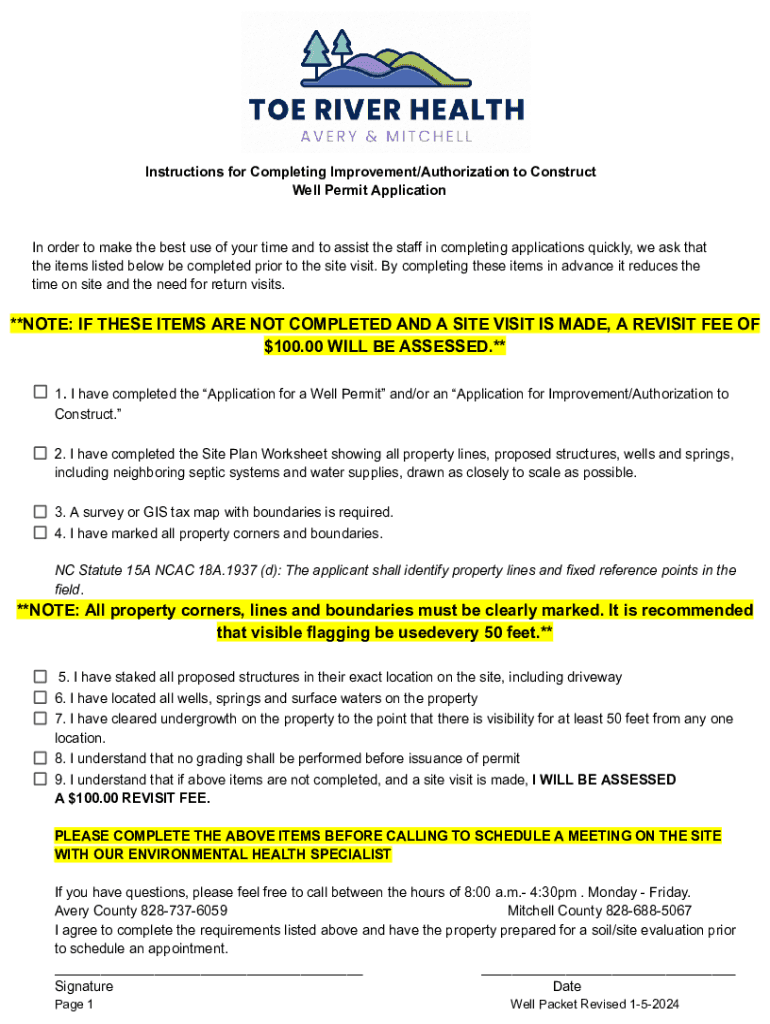 Instructions for Completing Improvement/Authorization to Construct Well Permit ApplicationIn order to make the best use of your time and to assist the staff in completing applications quickly, we