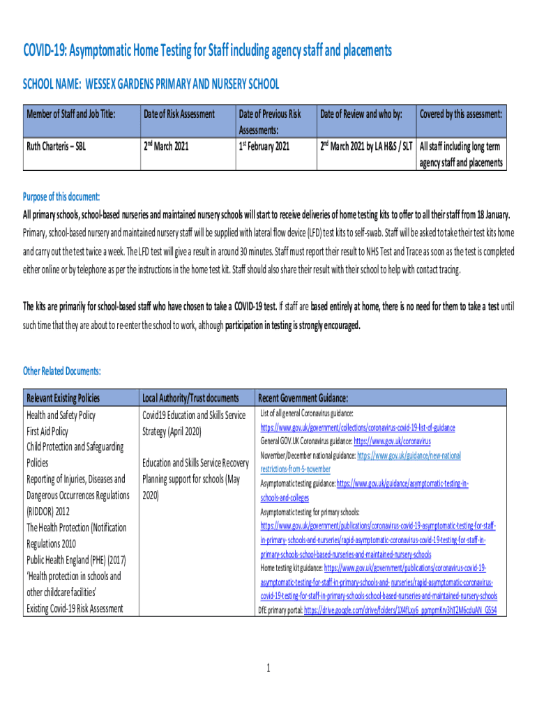 COVID19: Asymptomatic Home Testing for Staff including agency staff and placements SCHOOL NAME: WESSEX GARDENS PRIMARY AND NURSERY SCHOOL Member of Staff and Job Title:Date of Risk AssessmentRuth