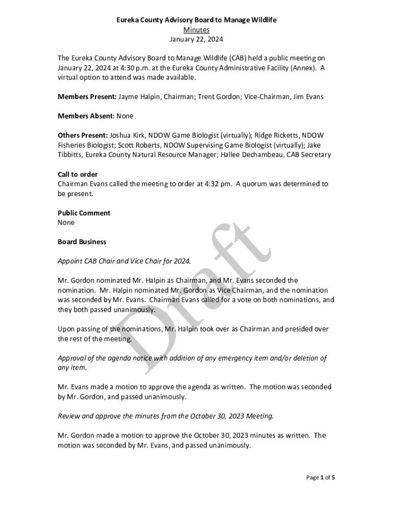 Eureka County Advisory Board to Manage Wildlife Minutes January 22, 2024 The Eureka County Advisory Board to Manage Wildlife (CAB) held a public meeting on January 22, 2024 at 4:30 p.m. at the Eureka