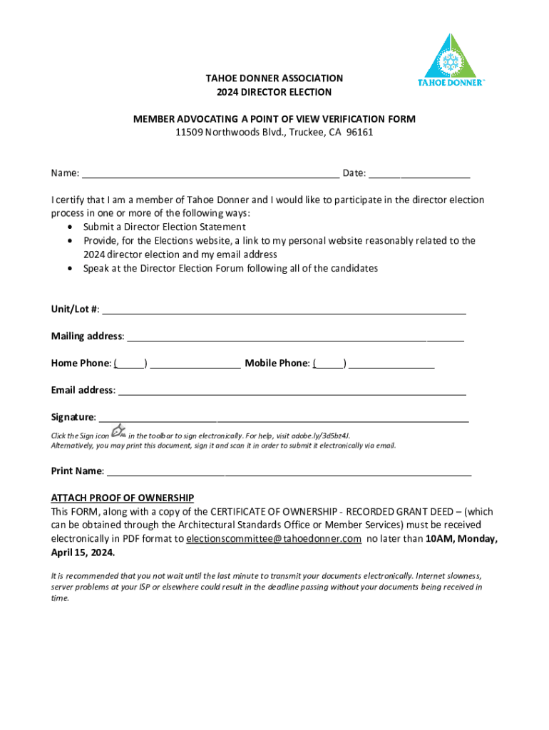 TAHOE DONNER ASSOCIATION 2024 DIRECTOR ELECTION MEMBER ADVOCATING A POINT OF VIEW VERIFICATION FORM 11509 Northwoods Blvd., Truckee, CA 96161Name: ___ Date: ___ I certify that I am a member of Tahoe
