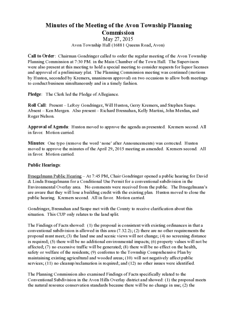Minutes of the Meeting of the Avon Township Planning Commission May 27, 2015 Avon Township Hall (16881 Queens Road, Avon) Call to Order: Chairman Gondringer called to order the regular meeting of