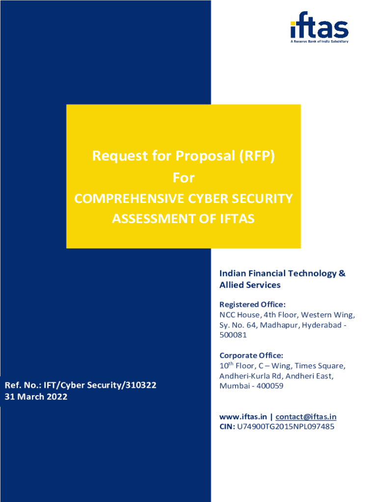 Request for Proposal (RFP) For COMPREHENSIVE CYBER SECURITY ASSESSMENT OF IFTASIndian Financial Technology & Allied Services Registered Office: NCC House, 4th Floor, Western Wing, Sy. No. 64, Madhapur,