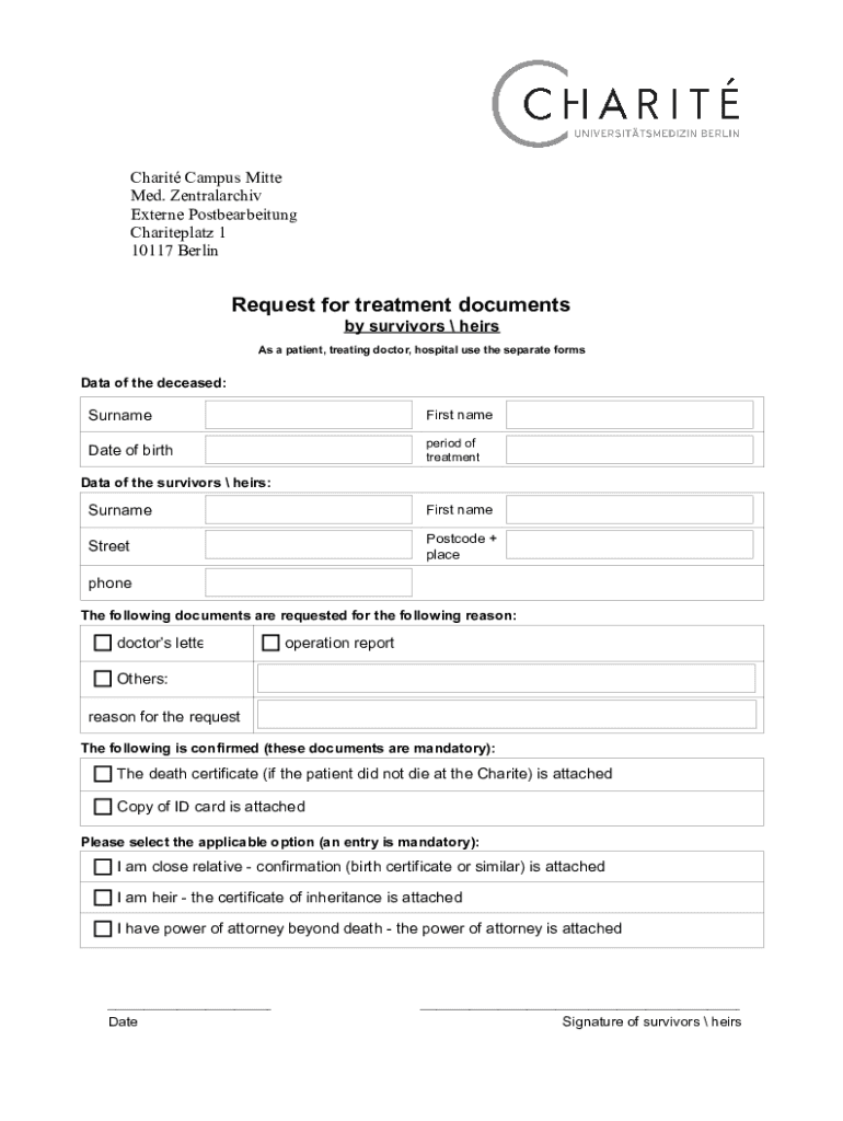 Charit Campus Mitte Med. Zentralarchiv Externe Postbearbeitung Chariteplatz 1 10117 BerlinRequest for treatment documents by survivors heirs As a patient, treating doctor, hospital use the separate