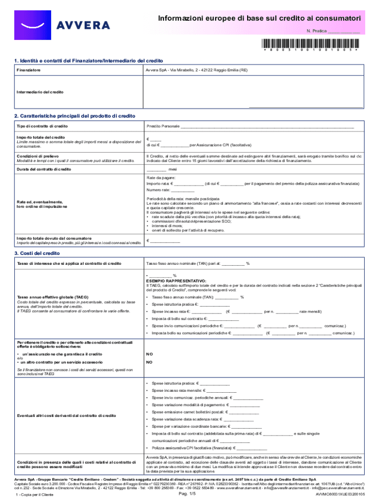 Informazioni europee di base sul credito ai consumatori 13UDWLFDBBBBBBBBBBBBB*80031001001005* 1. Identit e contatti del Finanziatore/Intermediario del credito Finanziatore$YYHUD6S$9LD0LUDEHOOR5HJJLR(PLOLD