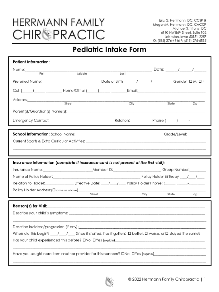 Eric G. Herrmann, DC, CCSP Megan M. Herrmann, DC, CACCP Michael S. Tiffany, DC 6110 NW 86th Street, Suite 102 Johnston, Iowa 501312257 O: (515) 2764946 F: (515) 2766535Pediatric Intake Form Patient