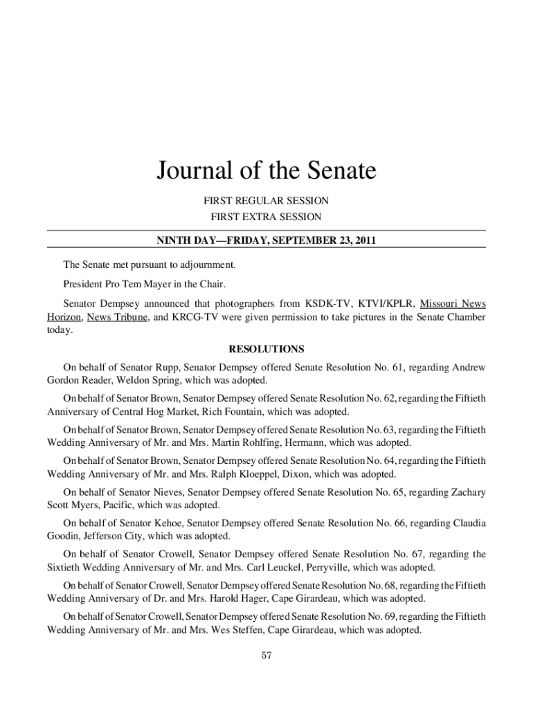 Journal of the Senate FIRST REGULAR SESSION FIRST EXTRA SESSION NINTH DAYFRIDAY, SEPTEMBER 23, 2011 The Senate met pursuant to adjournment. President Pro Tem Mayer in the Chair. Senator Dempsey announced