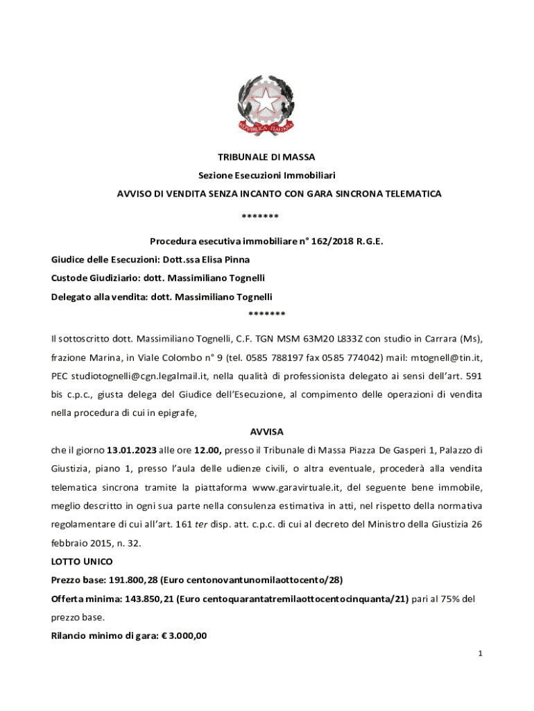 TRIBUNALE DI MASSA Sezione Esecuzioni Immobiliari AVVISO DI VENDITA SENZA INCANTO CON GARA SINCRONA TELEMATICA ******* Procedura esecutiva immobiliare n 162/2018 R.G.E. Giudice delle Esecuzioni: Dott.ssa