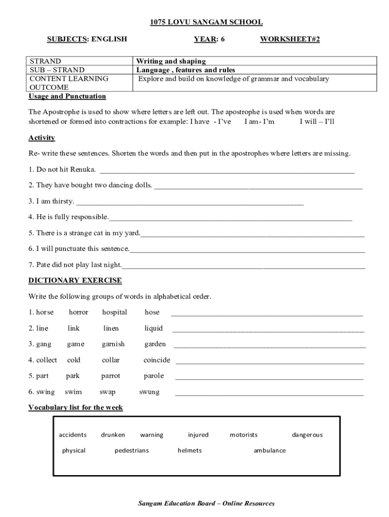 1075 LOVU SANGAM SCHOOL SUBJECTS: ENGLISH STRAND SUB STRAND CONTENT LEARNING OUTCOME Usage and PunctuationYEAR: 6WORKSHEET#2Writing and shaping Language , features and rules Explore and build on knowledge