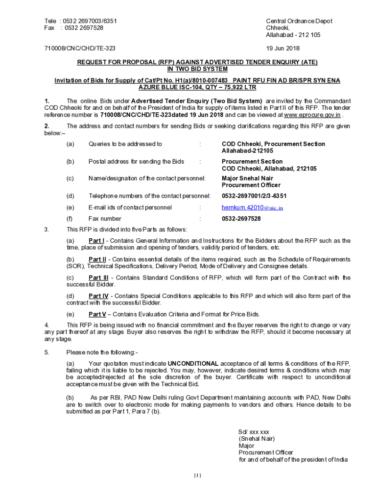 Tele : 0532 2697003/6351 Fax : 0532 2697528Central Ordnance Depot Chheoki, Allahabad 212 105710008/CNC/CHD/TE32319 Jun 2018REQUEST FOR PROPOSAL (RFP) AGAINST ADVERTISED TENDER ENQUIRY (ATE) IN TWO