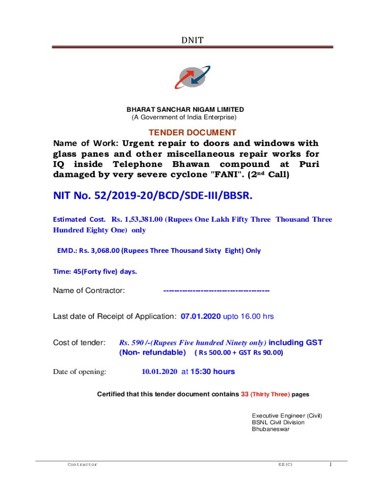DNITBHARAT SANCHAR NIGAM LIMITED (A Government of India Enterprise)TENDER DOCUMENTName of Work: Urgent repair to doors and windows with glass panes and other miscellaneous repair works for IQ inside