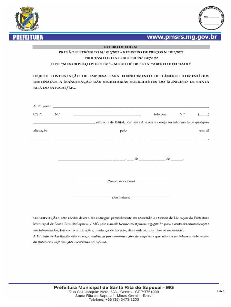 RECIBO DE EDITAL PREGO ELETRNICO N. 015/2022 REGISTRO DE PREOS N. 015/2022 PROCESSO LICITATRIO PRC N. 047/2022 TIPO: MENOR PREO POR ITEM MODO DE DISPUTA: ABERTO E FECHADOOBJETO: CONTRATAO DE EMPRESA