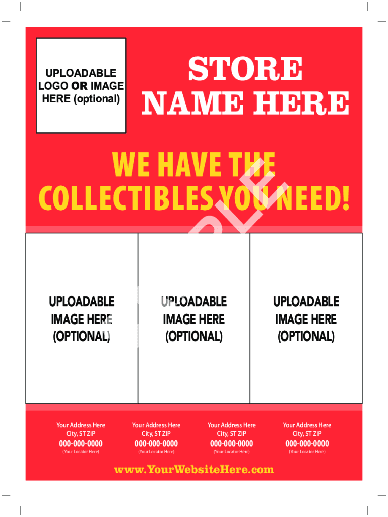 UPLOADABLE LOGO OR IMAGE HERE (optional)STORE NAME HEREUPLOADABLE IMAGE HERE (OPTIONAL)SAUPLOADABLE IMAGE HERE (OPTIONAL)MPLEWE HAVE THE COLLECTIBLES YOU NEED! UPLOADABLE IMAGE HERE (OPTIONAL)Your