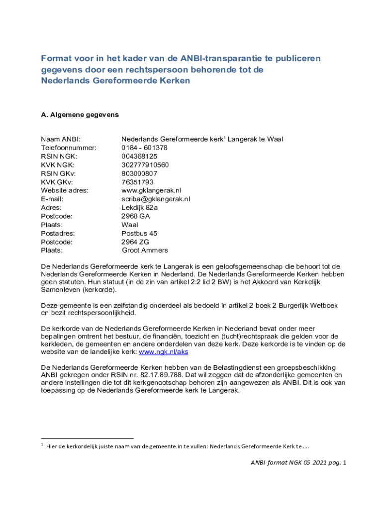 Format voor in het kader van de ANBItransparantie te publiceren gegevens door een rechtspersoon behorende tot de Nederlands Gereformeerde KerkenA. Algemene gegevensNaam ANBI: Telefoonnummer: RSIN