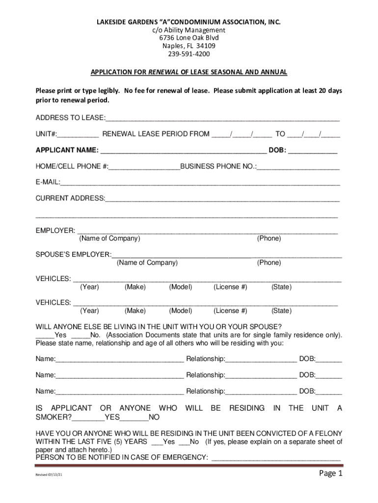 LAKESIDE GARDENS ACONDOMINIUM ASSOCIATION, INC. c/o Ability Management 6736 Lone Oak Blvd Naples, FL 34109 2395914200 APPLICATION FOR RENEWAL OF LEASE SEASONAL AND ANNUAL Please print or type legibly.
