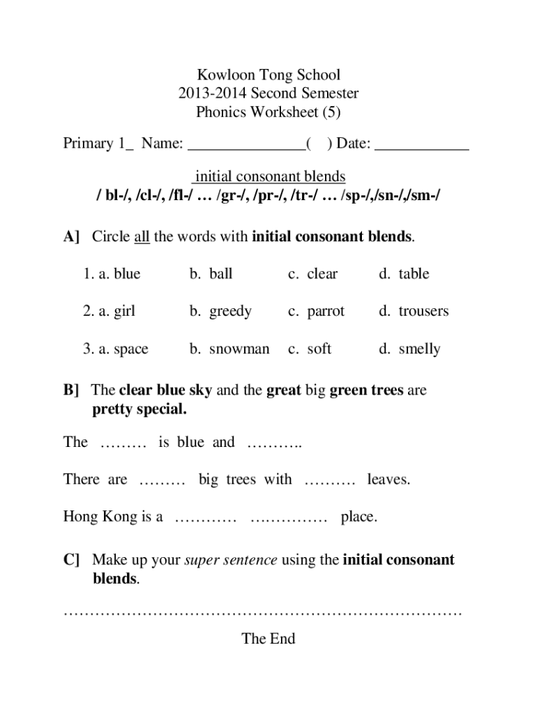 Primary 1_ Name: ___() Date: ___initial consonant blends