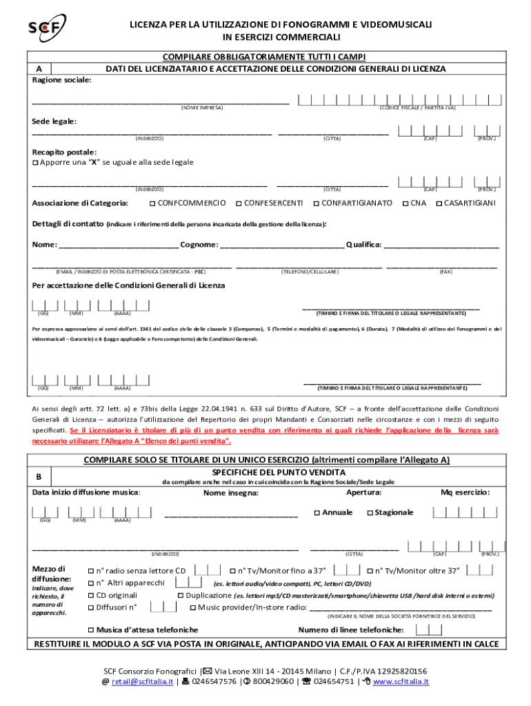 LICENZA PER LA UTILIZZAZIONE DI FONOGRAMMI E VIDEOMUSICALI IN ESERCIZI COMMERCIALI COMPILARE OBBLIGATORIAMENTE TUTTI I CAMPI DATI DEL LICENZIATARIO E ACCETTAZIONE DELLE CONDIZIONI GENERALI DI LICENZAA