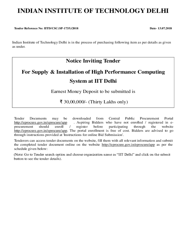 Tender Reference No: IITD/CSC(SP1735)/2018Date 13.07.2018Indian Institute of Technology Delhi is in the process of purchasing following item as per details as