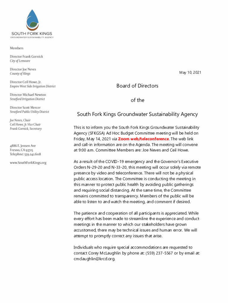 May 10, 2021Board of Directors of the South Fork Kings Groundwater Sustainability Agency This is to inform you the South Fork Kings Groundwater Sustainability Agency (SFKGSA) Ad Hoc Budget Committee