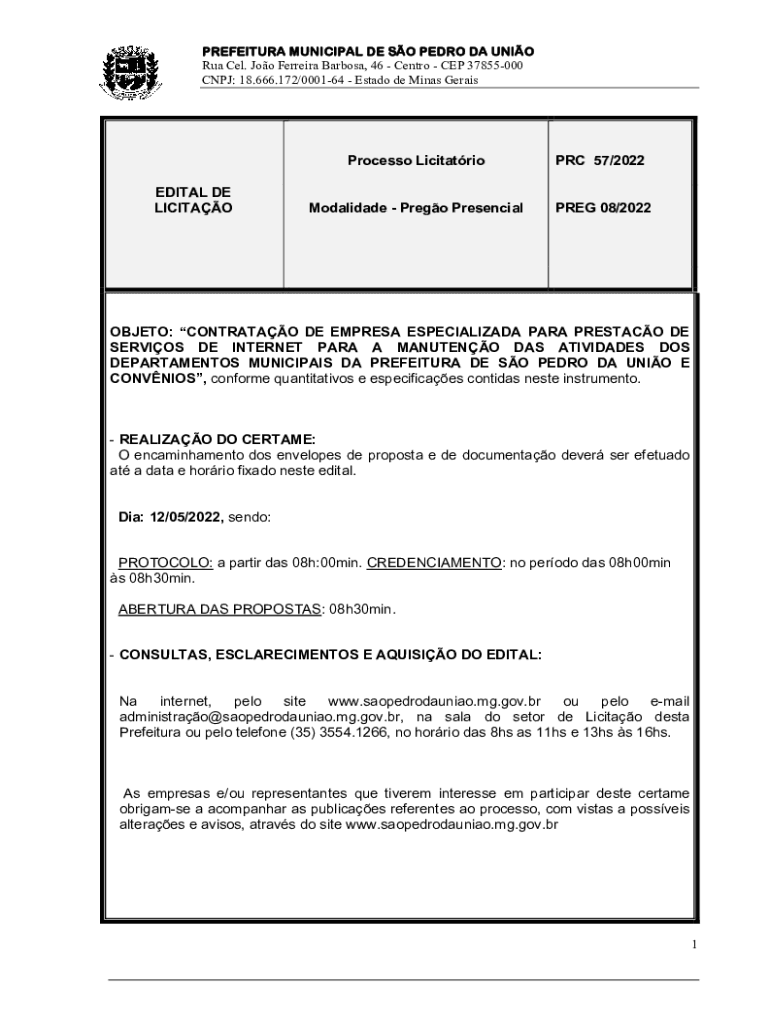 PREFEITURA MUNICIPAL DE SO PEDRO DA UNIO Rua Cel. Joo Ferreira Barbosa, 46 Centro CEP 37855000 CNPJ: 18.666.172/000164 Estado de Minas GeraisEDITAL DE LICITAOProcesso LicitatrioPRC 57/2022Modalidade