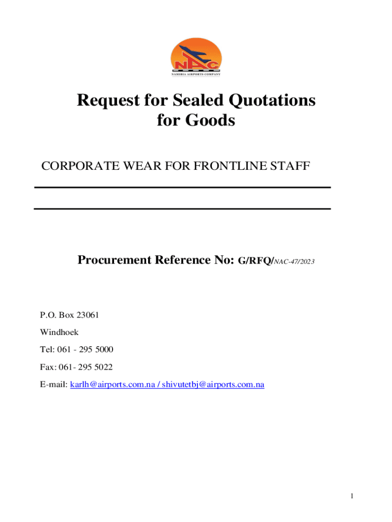 Request for Sealed Quotations for Goods CORPORATE WEAR FOR FRONTLINE STAFFProcurement Reference No: G/RFQ/NAC47/2023P.O. Box 23061 Windhoek Tel: 061 295 5000 Fax: 061 295 5022 Email: karlh@airports.com.na