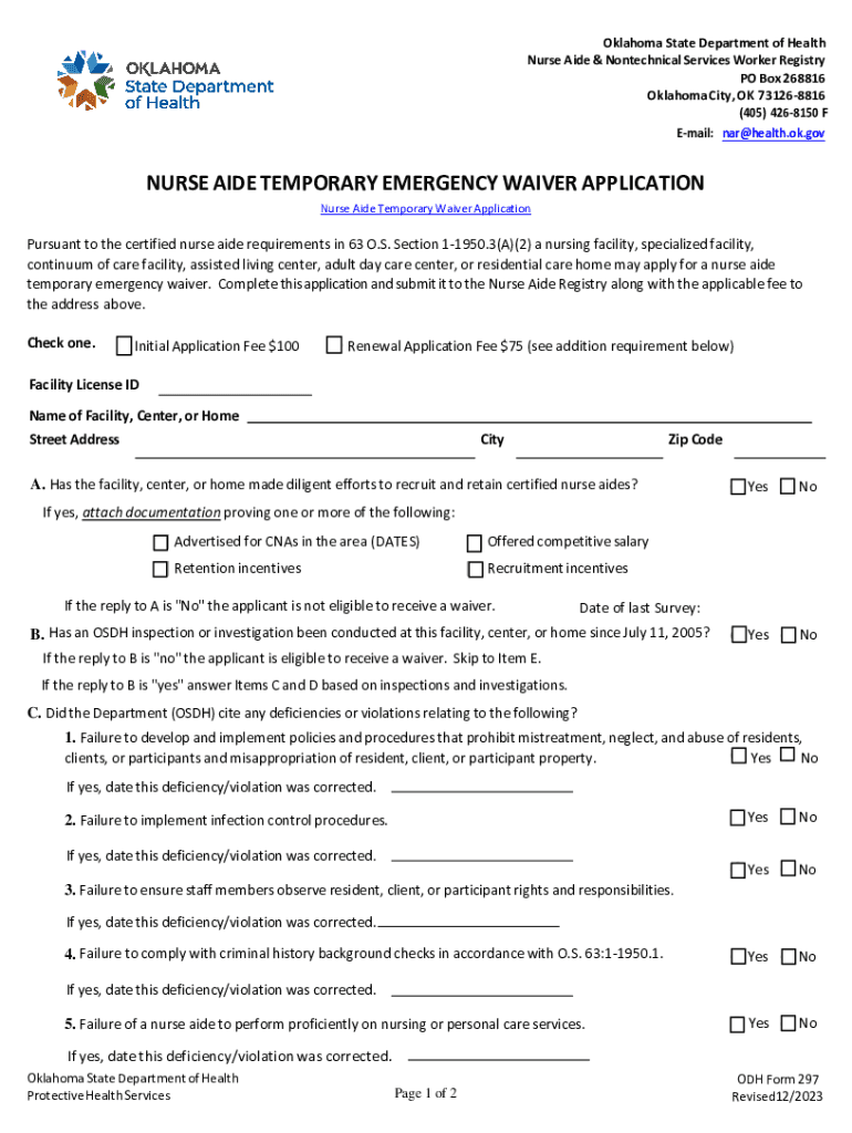 Oklahoma State Department of Health Nurse Aide & Nontechnical Services Worker Registry PO Box 268816 Oklahoma City, OK 731268816 (405) 4268150 F Email: nar@health.ok.govNURSE AIDE TEMPORARY EMERGENCY