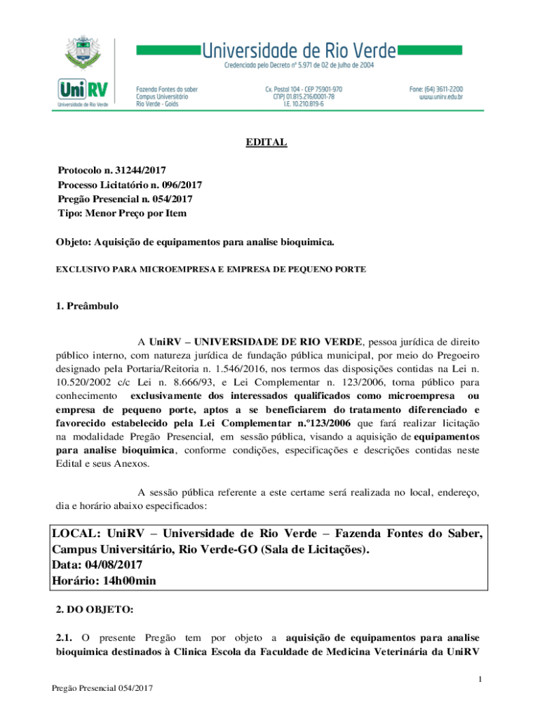 EDITAL Protocolo n. 31244/2017 Processo Licitatrio n. 096/2017 Prego Presencial n. 054/2017 Tipo: Menor Preo por Item Objeto: Aquisio de equipamentos para analise bioquimica. EXCLUSIVO PARA MICROEMPRESA