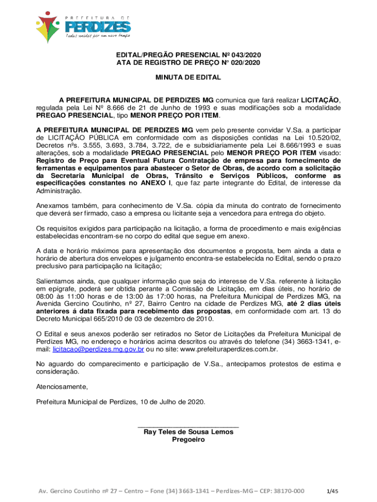 EDITAL/PREGO PRESENCIAL N 043/2020 ATA DE REGISTRO DE PREO N 020/2020 MINUTA DE EDITAL A PREFEITURA MUNICIPAL DE PERDIZES MG comunica que far realizar LICITAO, regulada pela Lei N 8.666 de 21 de Junho