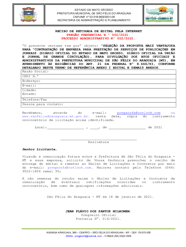ESTADO DE MATO GROSSO PREFEITURA MUNICIPAL DE SO FLIX DO ARAGUAIA CNPJ/MF n 03.918.869/000108 SECRETARIA DE ADMINISTRAO E PLANEJAMENTORECIBO DE RETIRADA DE EDITAL PELA INTERNET PREGO PRESENCIAL N.