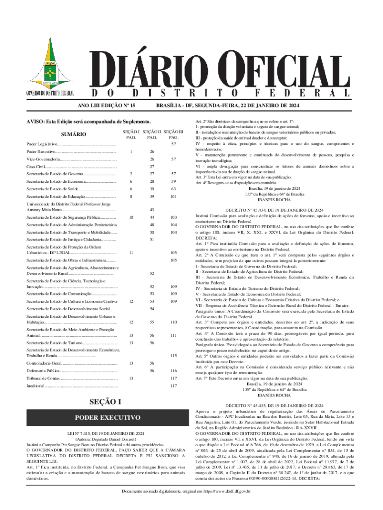ANO LIII EDIO N 15BRASLIA DF, SEGUNDAFEIRA, 22 DE JANEIRO DE 2024AVISO: Esta Edio ser acompanhada de Suplemento. SEO I SEO II SEO III PAG. PAG. PAG.SUMRIO Poder Legislativo.......................................................